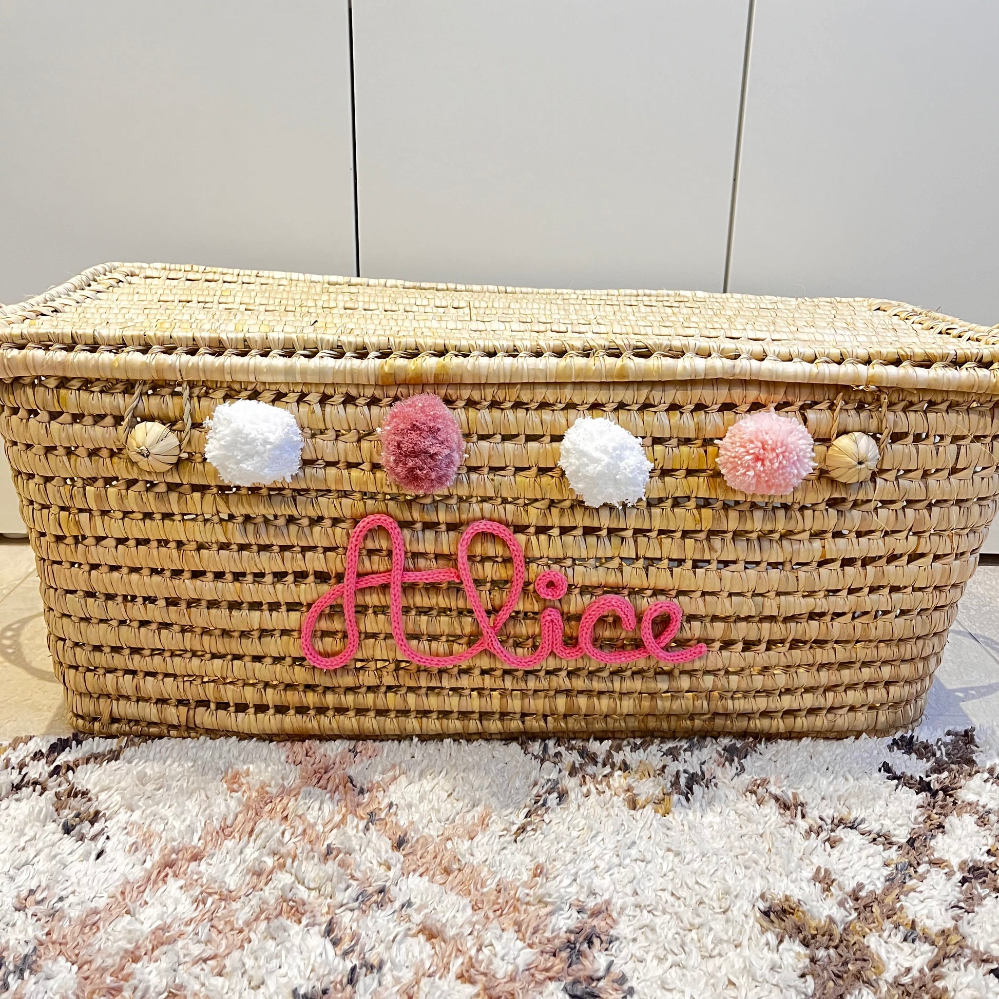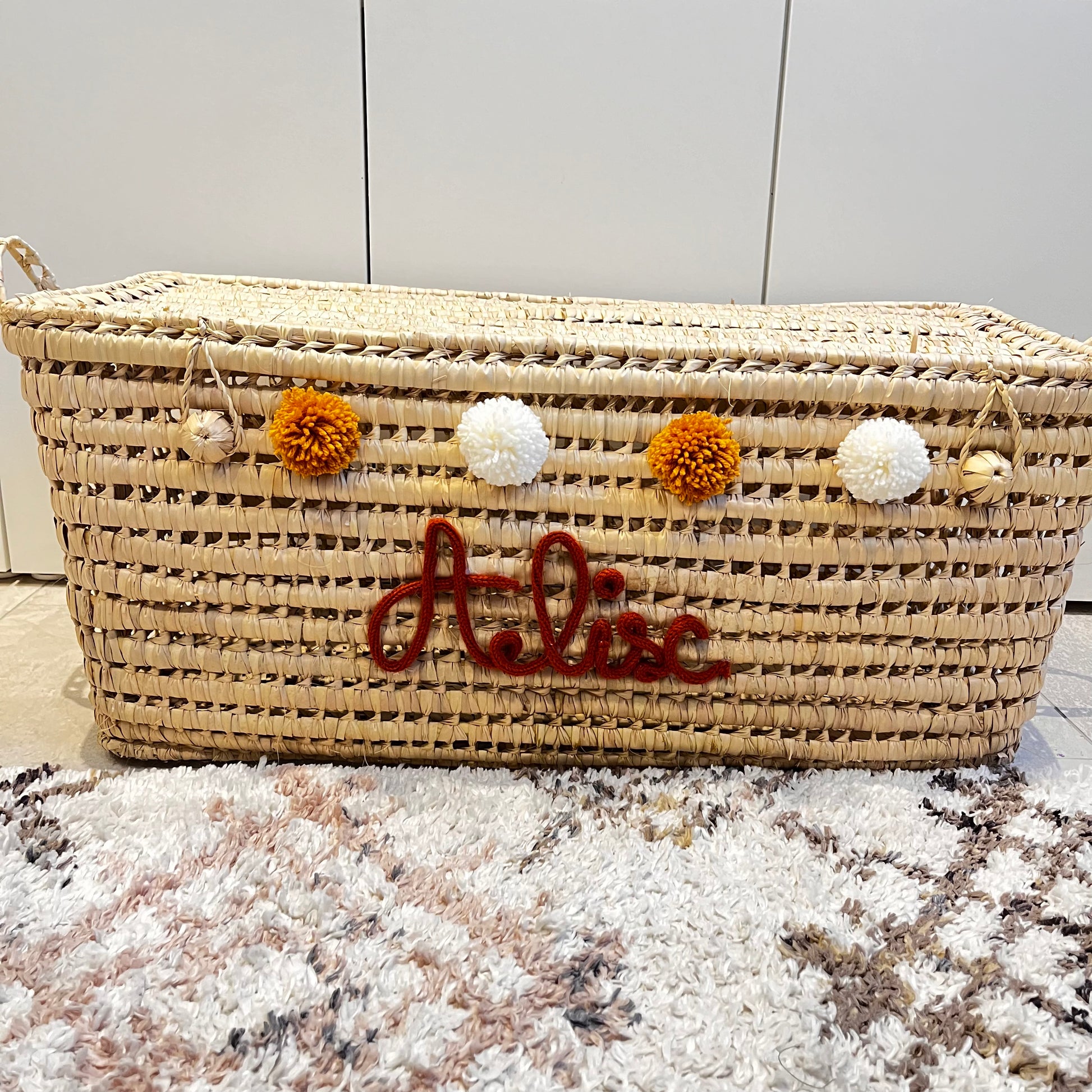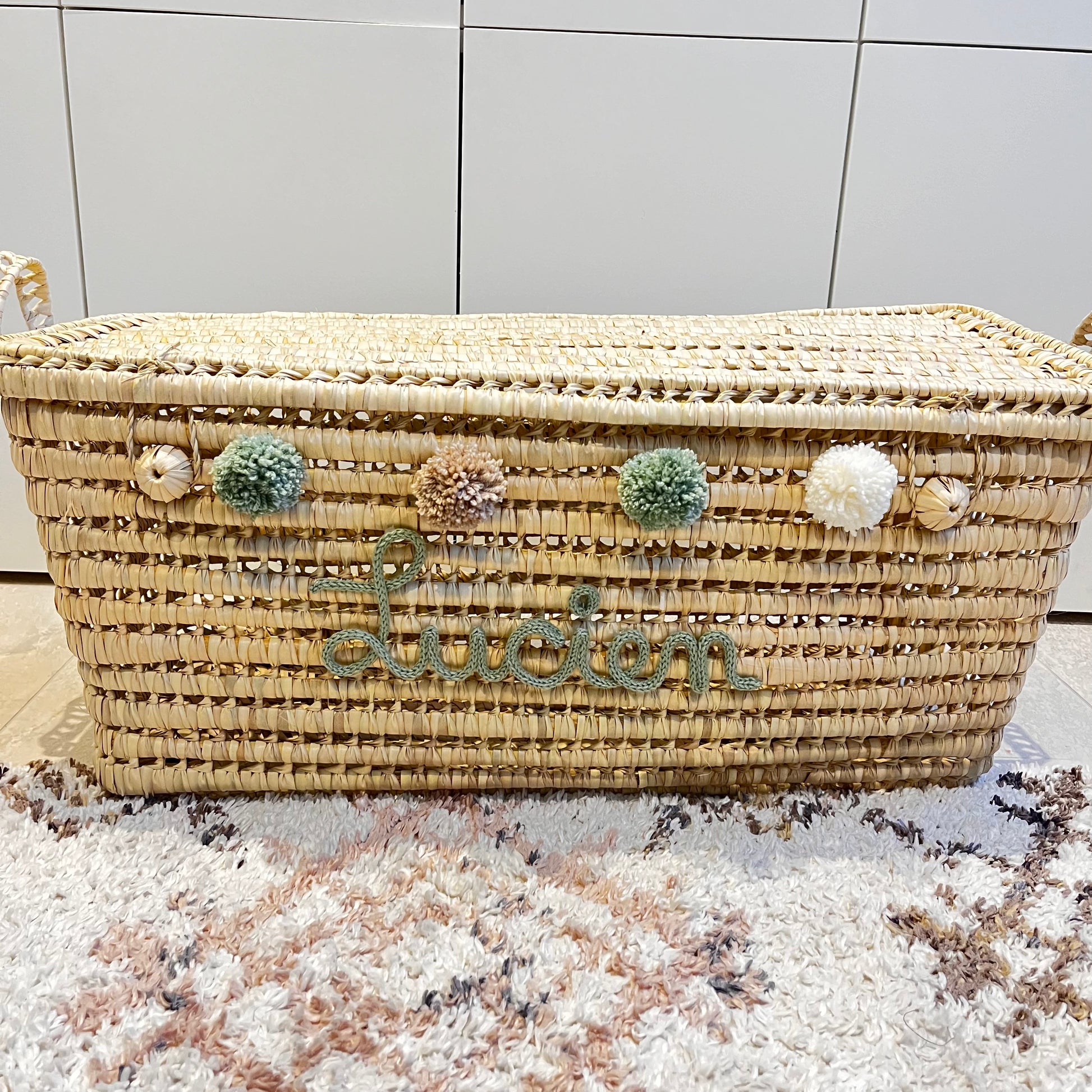Malle de rangement en fibre naturelle de palmier et osier, fabriquée à la main à Marrakech. Sa couleur apporte une touche bohème et naturelle. Elle peut être intégrée dans n'importe quel espace: le salon, les chambres d'enfants et les salles de jeux. Elle comprend un couvercle, une poignée de chaque côté et deux énormes boutons pour une fermeture simple. Sa personnalisation apportera une touche unique.